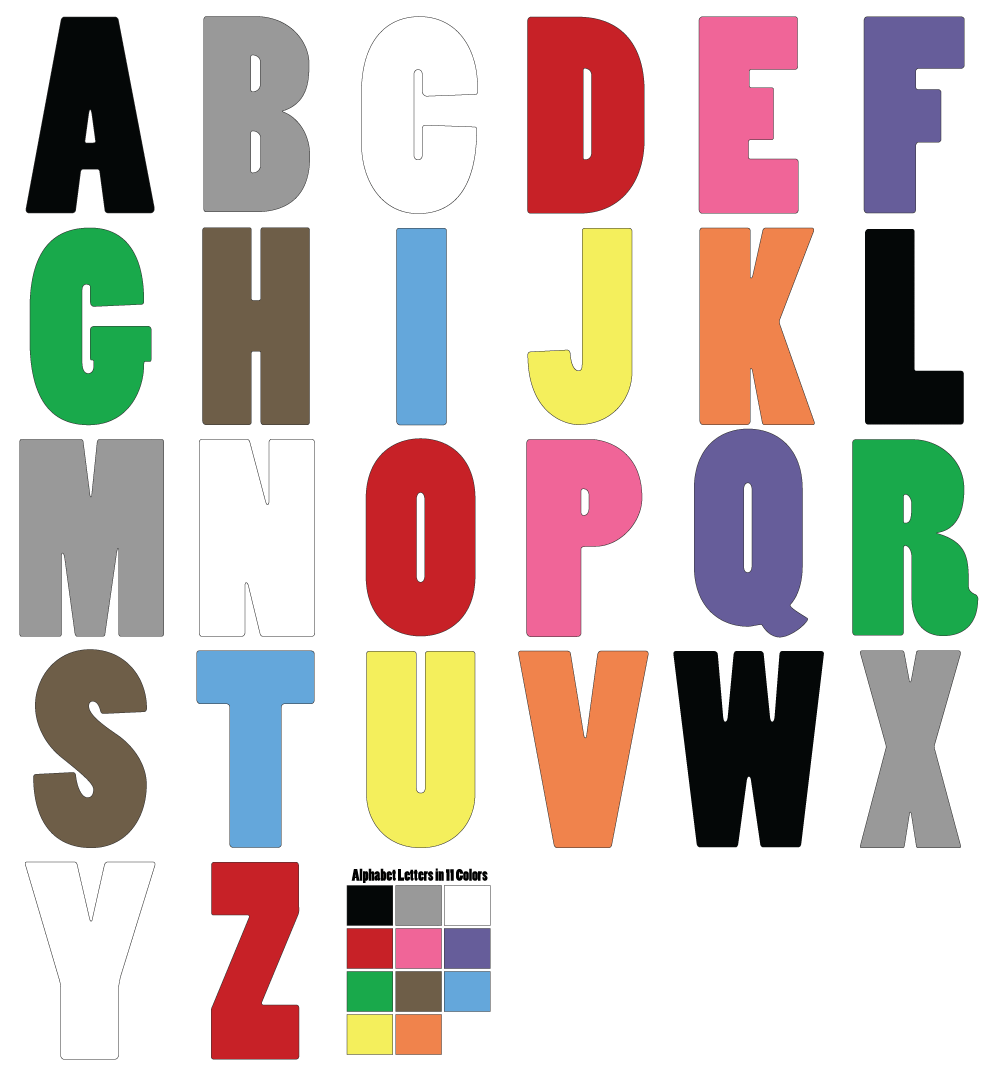 All 26 letters in 11 different colors. Yes, that's 286 letters total. Note: White's border may exceed .25 inch margins as it's meant to be trimmed.